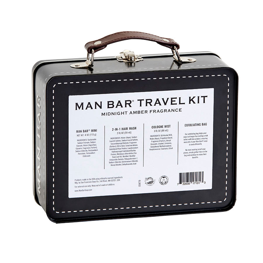 Man Bar Travel Kit includes TSA approved mini soap, 2-in-1 hair wash, cologne mist, exfoliating soap saver bag packed in a reusable tin with a leather-style handle.