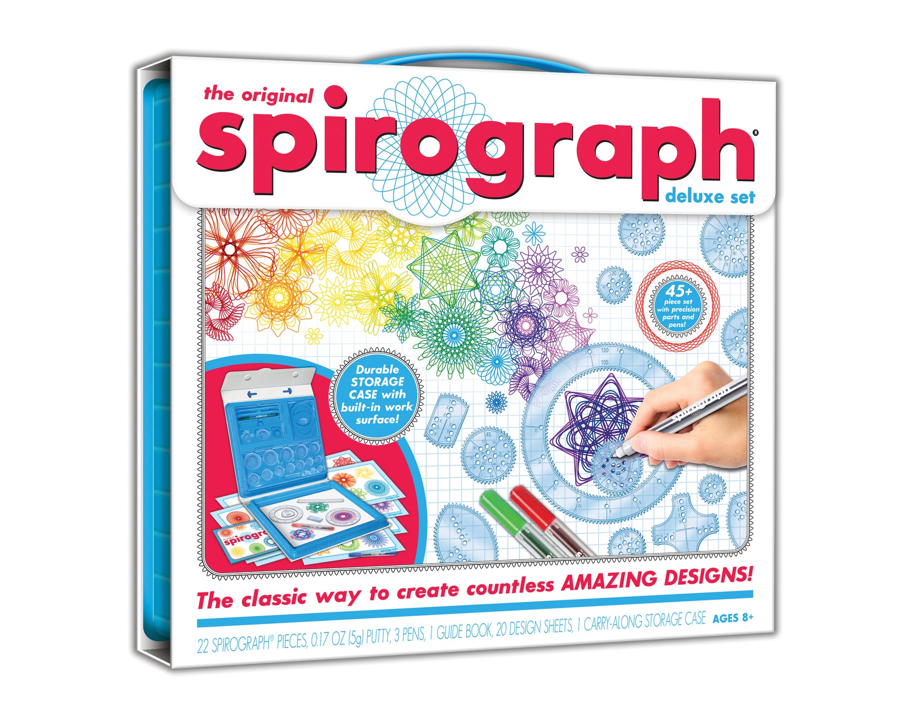 Updated classic with precision gears, pens, design paper, putty, and built-in drawing surface in a durable case; ages 8+.