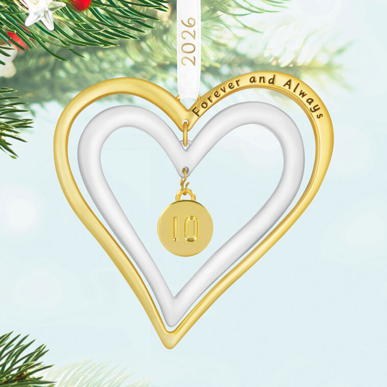 Remind a husband, wife or partner that you are forever and always in love. Perfect for commemorating a relationship or wedding anniversary, this year-dated 2026 metal Christmas tree ornament features double hearts in gold and white. Personalize the ornament by attaching one of the included round charms to display different anniversary years (1, 5, 10, 25, 50), a rainbow or write your own on a blank back.